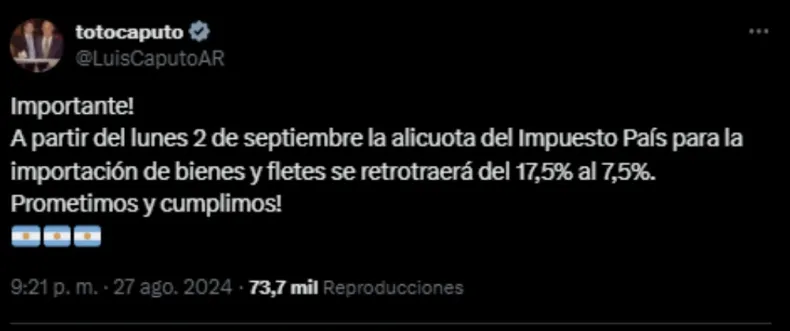 "A partir del lunes 2 de septiembre la alícuota del Impuesto País para la importación de bienes y fletes se retrotraerá del 17,5% al 7,5%. Prometimos y cumplimos!", publicó Caputo, quien previamente había adelantado en diciembre será la eliminación de dicho impuesto.