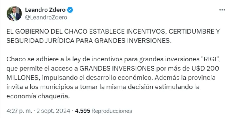 "El Gobierno del Chaco establece incentivos, certidumbre y seguridad jurídica para grandes inversiones", expresó el Gobernador en sus redes sociales.