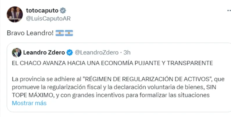 "¡Bravo Leandro!", publicó Caputo en su cuenta de X, citando la publicación del Gobernador sobre el Régimen de Regularización de Activos aprobado este lunes en la Legislatura chaqueña en sesión extraordinaria.