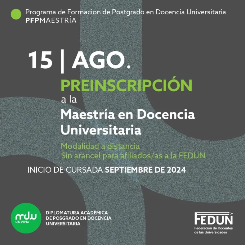 Hasta el 11 de septiembre tienen tiempo de preinscribirse los docentes afiliados a ADUNCAUS FEDUN, para cursar de forma virtual la Maestría en Docencia en Docencia Universitaria y la Diplomatura Académica de Posgrado en Docencia Universitaria.