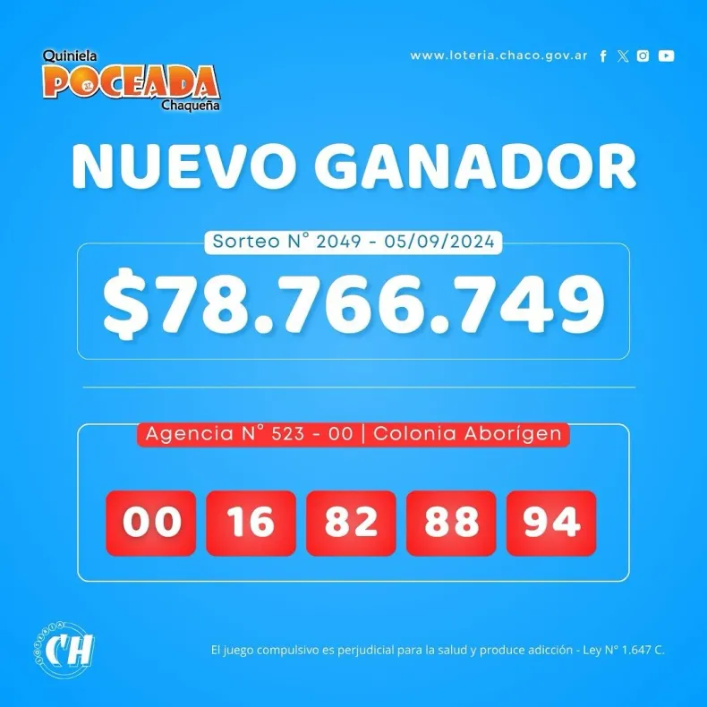 Se realizó un nuevo sorteo (N°2049) de la Poceada de Lotería Chaqueña este jueves 5 de septiembre a las 21 horas y arrojó un nuevo ganador que se llevó más de 78.000.000 de pesos.