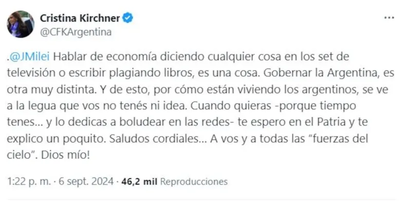 Y añadió: "Cuando quieras -porque tiempo tenés y lo dedicas a boludear en las redes- te espero en el Patria y te explico un poquito. Saludos cordiales. A vos y a todas las "fuerzas del cielo". ¡Dios mío!".