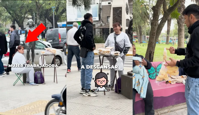Un joven compartió en redes sociales el conmovedor gesto que tuvo con una mujer que vende chipa en la intersección de avenida 9 de Julio y calle Güemes, para que ella pueda descansar.