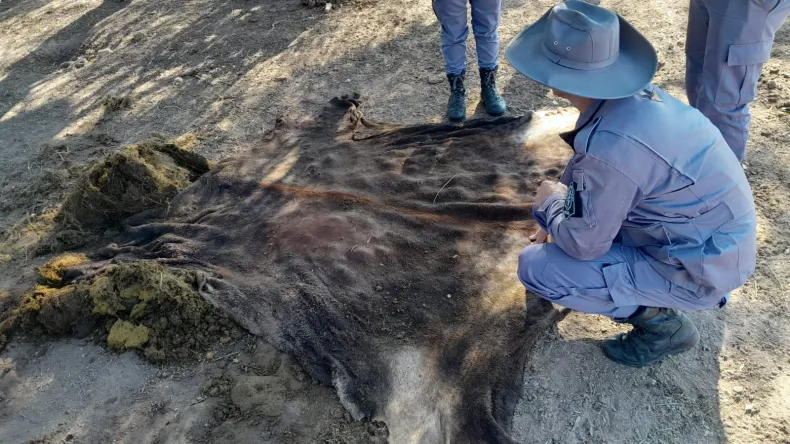 Posteriormente, los agentes ubicaron el lugar de la faena en el Paraje Mala y, con la orden judicial, realizaron un allanamiento en el que se incautaron un cuero vacuno, equipo de aparejo y cuchillos.