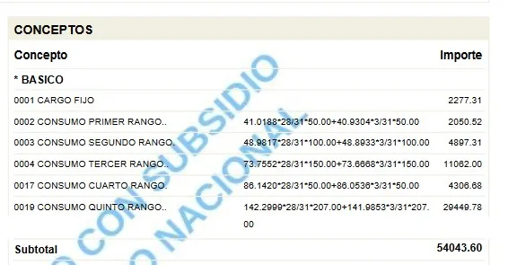 Este es el sector que podría parecer más complicados, pero todo lo contrario. Expresa de manera clara cada uno de los valores dependientes del consumo y del subsidio recibido. Siempre partiendo de un cargo fijo que varía dependiendo la categoría del domicilio.