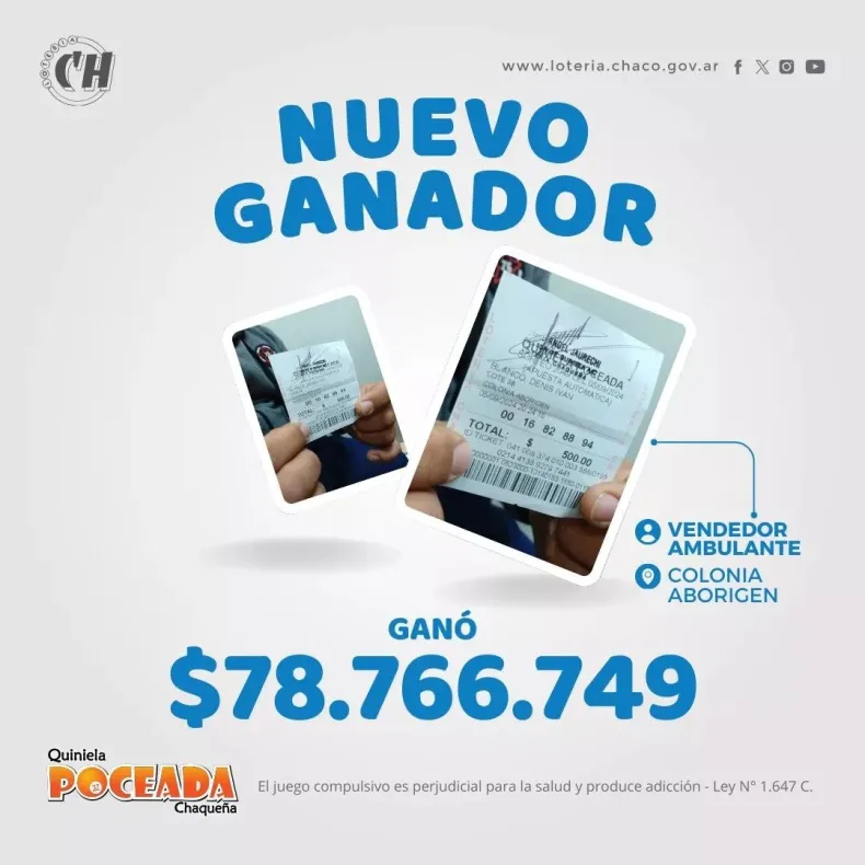 La suerte volvió a tocar las puertas de un hombre de Colonia Aborigen. Un vendedor ambulante se convirtió en el flamante ganador del sorteo N°2049 de la Poceada de Lotería Chaqueña, realizado el pasado jueves 5 de septiembre. El afortunado se alzó con un impresionante premio de $ 78.766.749.