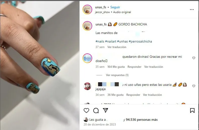El diseño, que recrea la letra de la canción "Perro Salchicha, gordo bachicha", capturo la atención de miles de usuarios en redes sociales. El video en el que muestra el trabajo realizado sobre las uñas de una cliente acumuló más de 4 millones de reproducciones, 94.500 "me gusta", 504 comentarios y fue compartido más de 58.100 veces.