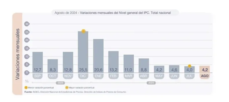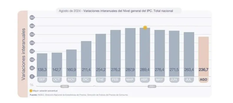 Este miércoles, el Instituto Nacional de Estadísticas y Censos (INDEC) brindó los datos del Índice de Precios al Consumidor y demostró que, en agosto de 2024, la inflación fue del 4,2%, mientras que la interanual llegó al 236,7%.