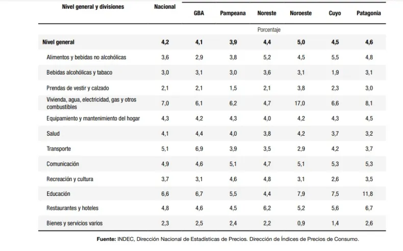 Por su parte, "Educación" registró un 4,4%, "Equipamiento y mantenimiento del hogar" un 4%, "Salud" 3,8% y "Bebidas alcohólicas y tabaco" 3,6%. A su vez, categorías como "Transporte" alcanzaron un 3,5%, "Bienes y servicios varios" 2,2% y "Prendas de vestir y calzado" 2.1%.