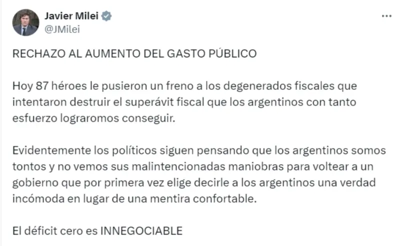 "Rechazo al aumento del gasto público. Hoy 87 héroes le pusieron un freno a los degenerados fiscales que intentaron destruir el superávit fiscal que los argentinos con tanto esfuerzo lograremos conseguir", publicó.