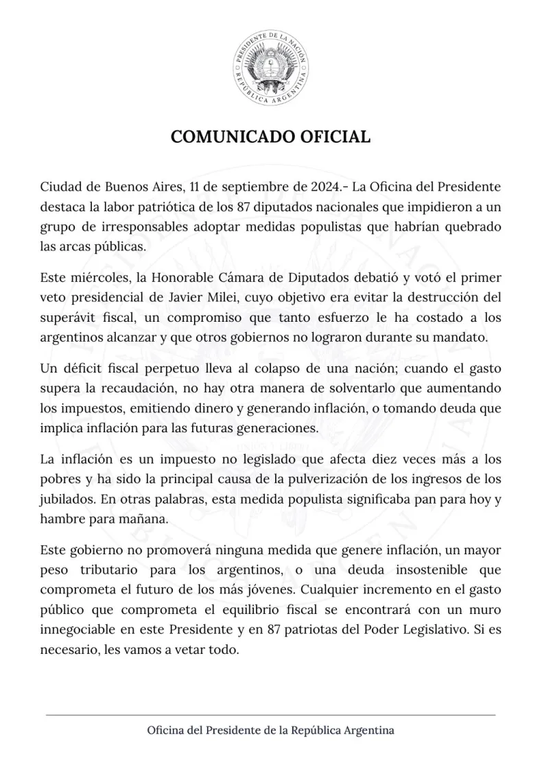 "Este gobierno no promoverá ninguna medida que genere inflación, un mayor peso tributario para los argentinos, o una deuda insostenible que comprometa el futuro de los más jóvenes. Cualquier incremento en el gasto público que comprometa el equilibrio fiscal se encontrará con un muro innegociable en este Presidente y en 87 patriotas del Poder Legislativo", indicó el comunicado y cerró: "Si es necesario, les vamos a vetar todo".