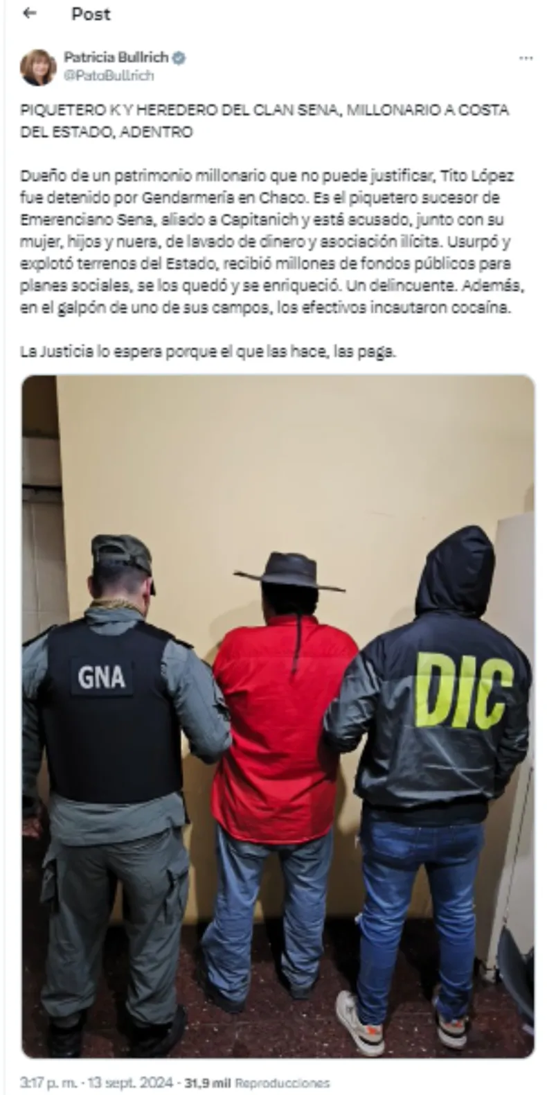 El posteo encabezó la siguiente afirmación: "PIQUETERO K Y HEREDERO DEL CLAN SENA, MILLONARIO A COSTA DEL ESTADO, ADENTRO". Así, continuó describiendo el hecho en sí expresando: "Dueño de un patrimonio millonario que no puede justificar, Tito López fue detenido por Gendarmería en Chaco".