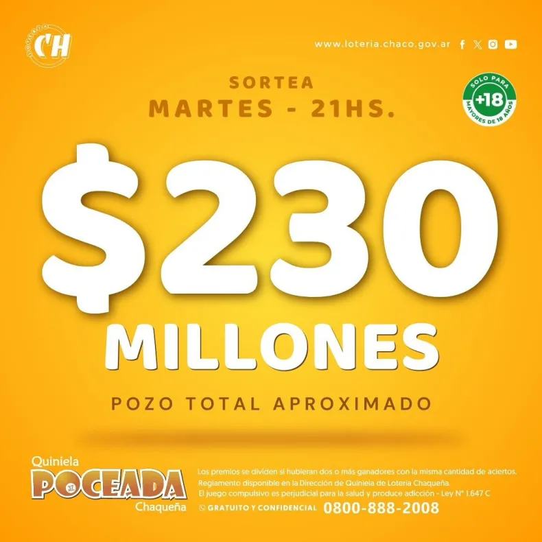 Este sábado 14, se realizó el sorteo N°2053 de la quiniela Poceada Chaqueña, cuyo premio mayor no registró ganadores y para este martes 17, se acumuló un pozo aproximado de más de 320 millones de pesos.
