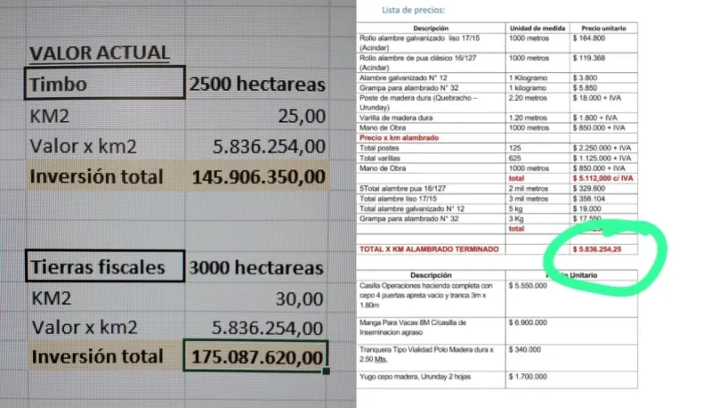 De acuerdo a parte del expediente al que accedió Diario TAG, se especificaron algunos valores vinculados al campo "El Timbó", que habría sido usurpado por López. Entre ellos, se supo que dicho campo cuenta con 2.500 hectáreas y su cercado perimetral costó un total de $ 145.906.350. A esto debe sumarse el valor total del cerramiento en las tierras fiscales, compuestas por 3000 hectáreas y cuyo valor asciende a los $ 175.087.620.