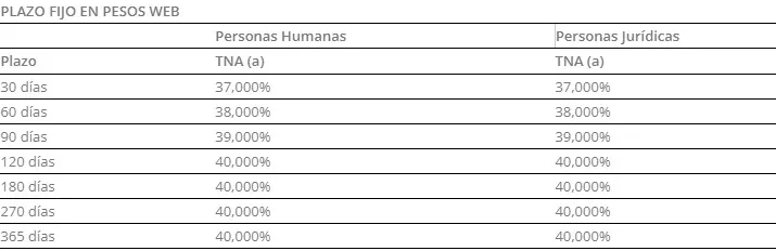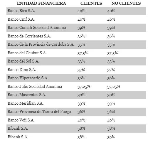A continuación, se detallan las tasas de interés informadas al Banco Central por los 10 bancos argentinos con mayor cantidad de depósitos en plazos fijos. La tabla distingue entre las tasas ofrecidas para clientes de la entidad y aquellas para no clientes, quienes tienen habilitada solo una cuenta para realizar depósitos a plazo fijo.