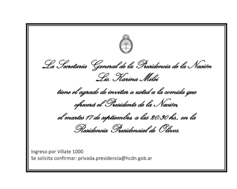 Las invitaciones fueron enviadas a los correos institucionales de los comensales con la firma de la secretaria general de la presidencia, Karina Milei. Sin embargo, no aclaraba lo anunciado por Adorni sobre que debían pagar por la comida.