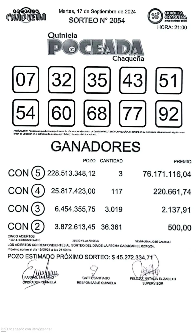 Después de varios pozos vacantes, salió La Poceada. El sorteo 2054 del juego más popular de Lotería Chaqueña repartió 228 millones de pesos acumulados entre tres ganadores.