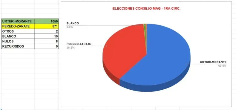 Las elecciones se iniciaron este miércoles a las 8 horas y concluyeron cerca de las 15 horas. El triunfo de los candidatos del Consejo de Abogados fue categórico: la fórmula integrada por Ricardo Urturi y Cecilia Morante obtuvo el 60,5% de los votos.