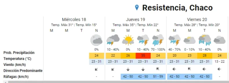 De acuerdo al pronóstico extendido, en Resistencia, durante la mañana de este jueves habrá entre un 10 y 40% de probabilidades de precipitaciones. Dicha probabilidad aumentará a 70% para la tarde-noche. Las temperaturas rondarán entre los 22 y 35 grados y habrá ráfagas de entre 42 y 59 kilómetros por hora.