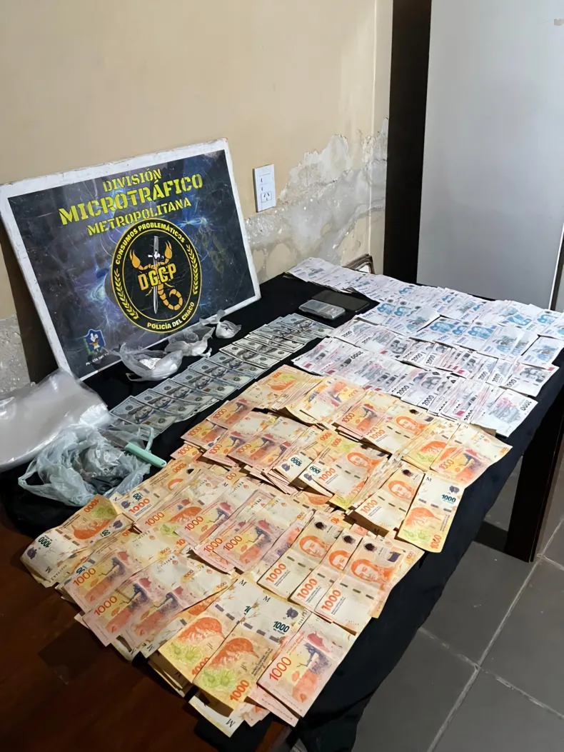 La labor policial arrojó como resultado la detección de 139 gramos de cocaína en 3 trozos compactos tipo piedras, una balanza de precisión, un celular, varios recortes de polietileno, dos cuchillos de cocina y una tijera, ambos con restos de sustancia, 2 mil dólares, y dinero en efectivo por la suma de $ 1.311.120.