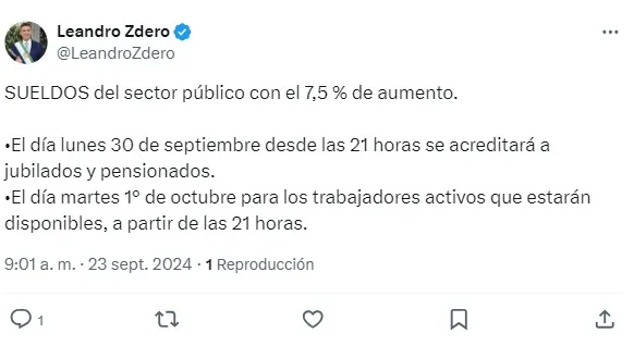 El Gobierno de la provincia anunció que a partir del lunes 30 de septiembre se comenzará a acreditar el pago de sueldos del sector público, con un aumento del 7,5%, a través de los cajeros automáticos del Nuevo Banco del Chaco y el martes 1 de octubre, por ventanilla.
