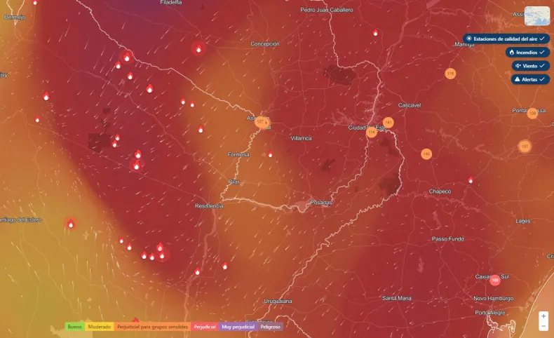El fuego azota a países limítrofes como Brasil, Bolivia y Paraguay y el humo de estos focos ígneos invade nuestra provincia junto con los vientos del noroeste y las altas temperaturas. La gran cantidad de partículas contaminadas están deteriorando la calidad del aire en la región que se estima llegó a "niveles perjudiciales" según las imágenes satelitales de los niveles de contaminación. El martes podría haber un alivio con la aparición de vientos del sector sur.