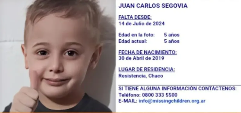 Las autoridades están buscando intensamente a Juan Carlos Segovia, un niño de 5 años que se encuentra desaparecido desde el 14 de julio de 2024. La alerta fue difundida por Missing Children Argentina, y las investigaciones fueron activadas de inmediato por el Equipo Fiscal N° 6 a cargo del fiscal Roberto Villalba.