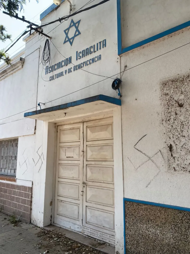 La sede de la comunidad israelita, ubicada en la calle Rivadavia 51, un lugar que había estado desocupado durante los últimos dos meses, fue sorprendida con varias pintadas de esvásticas. Esto provocó la inmediata intervención de la Fiscalía N° 3, a cargo de Sergio Ríos.