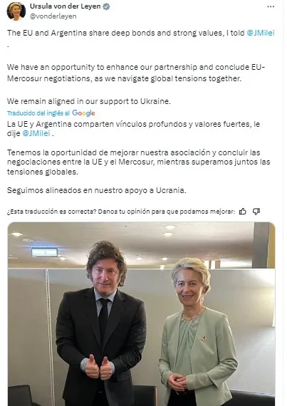 Todo esto se dio posterior al discurso del Milei en donde tildó a la ONU como "burócratas internacionales" que, en lugar de "perseguir la paz", buscan "imponer una agenda ideológica a sus miembros", se reunió con von der Leyen como última actividad de la gira por Nueva York.