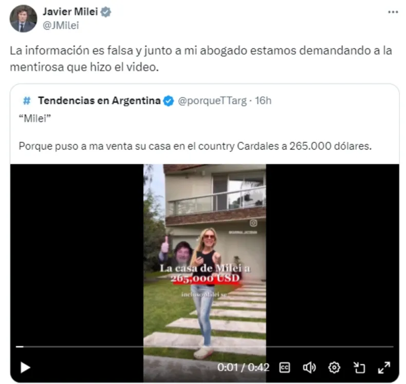 La publicación llegó hasta el presidente Javier Milei, quien desmintió el video y avisó que demandará a la asesora de ventas. "La información es falsa y junto a mi abogado estamos demandando a la mentirosa que hizo el video", confirmó en su cuenta de X.