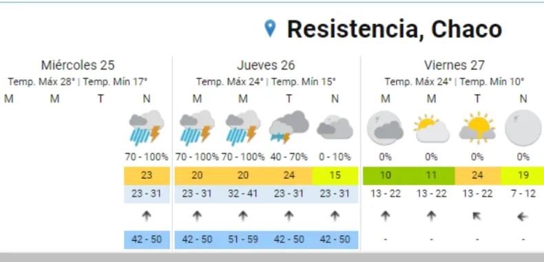 De acuerdo al pronóstico extendido, en Resistencia, las lluvias iniciarían durante las últimas horas de este miércoles y continuarían durante la madrugada y mañana de este jueves. Las temperaturas rondarán entre los 15 y 24 grados y habrá ráfagas de entre 42 y 50 kilómetros por hora.