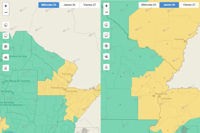 El nivel amarillo indica la posibilidad de "fenómenos meteorológicos con capacidad de daño y riesgo de interrupción momentánea de actividades cotidianas" y afectará a los departamentos de Bermejo, General Donovan, Libertad, Primero de Mayo y San Fernando.