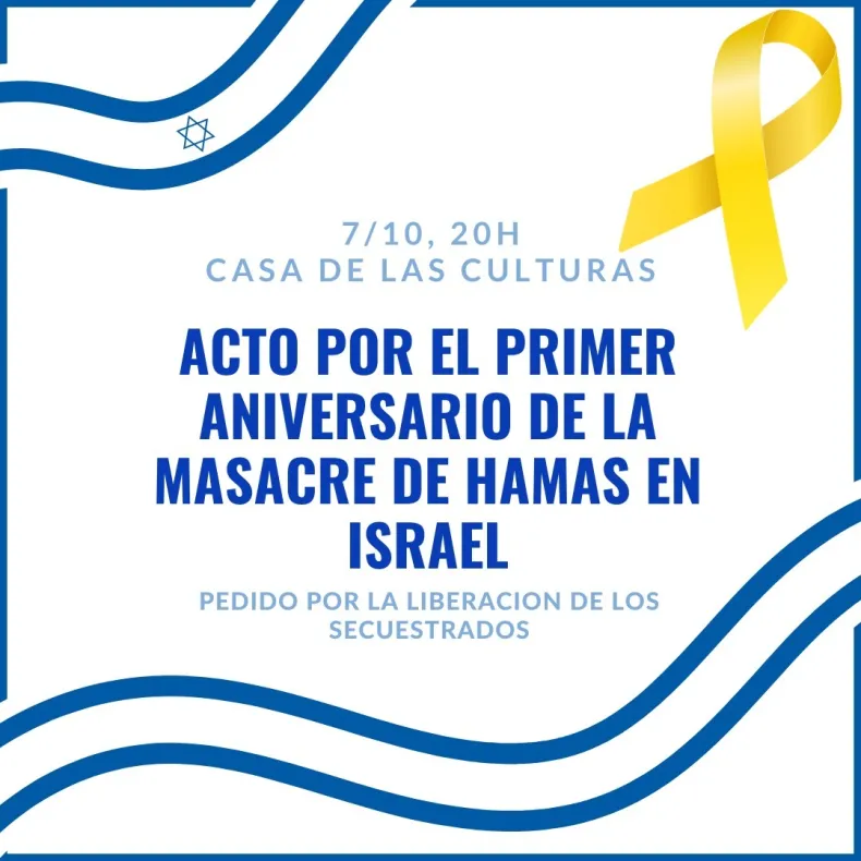La Comunidad Judía de Resistencia invita a participar de la ceremonia de conmemoración del primer aniversario de la masacre de Hamas en Israel, que se llevará a cabo el día 07 de octubre de 2024, a las 20 horas, en la Casa de las Culturas de la ciudad de Resistencia, sito en Marcelo T. de Alvear Nº 90, ciudad.