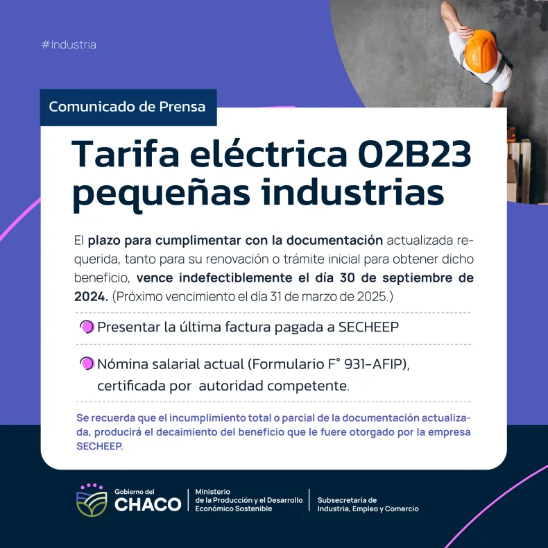 El Ministerio de la Producción y El Desarrollo Económico Sostenible, comunica a los usuarios comprendidos en la tarifa eléctrica categoría "02B23" (hasta <50 kw) y beneficiados con la bonificación, que el plazo para cumplimentar con la documentación actualizada requerida, tanto para su renovación o trámite inicial para obtener dicho beneficio, vence indefectiblemente el día 30 de septiembre de 2024.