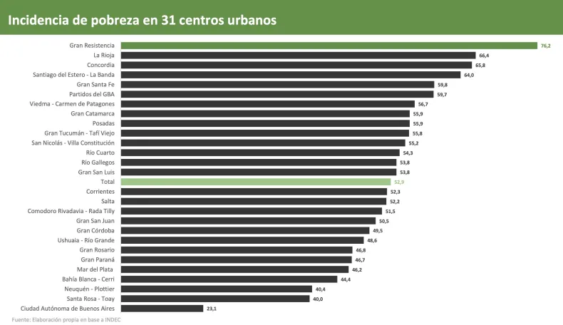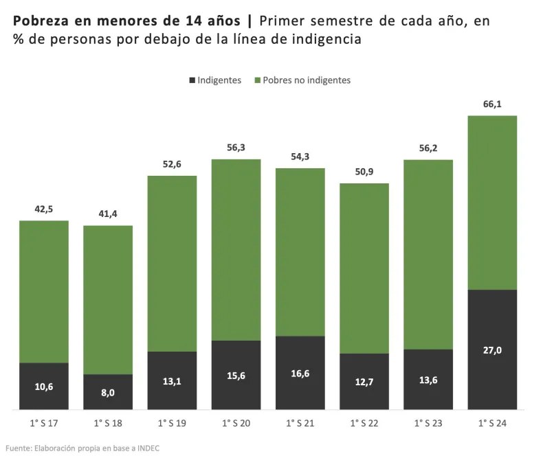 En esa línea, afirmó que "la situación es más crítica cuando segmentamos en menores de 14 años". "En los últimos doce meses, la indigencia de duplicó (pasó de 13,6% a 27%) y la pobreza llegó al 66% (+10 p.p.)", aseveró.