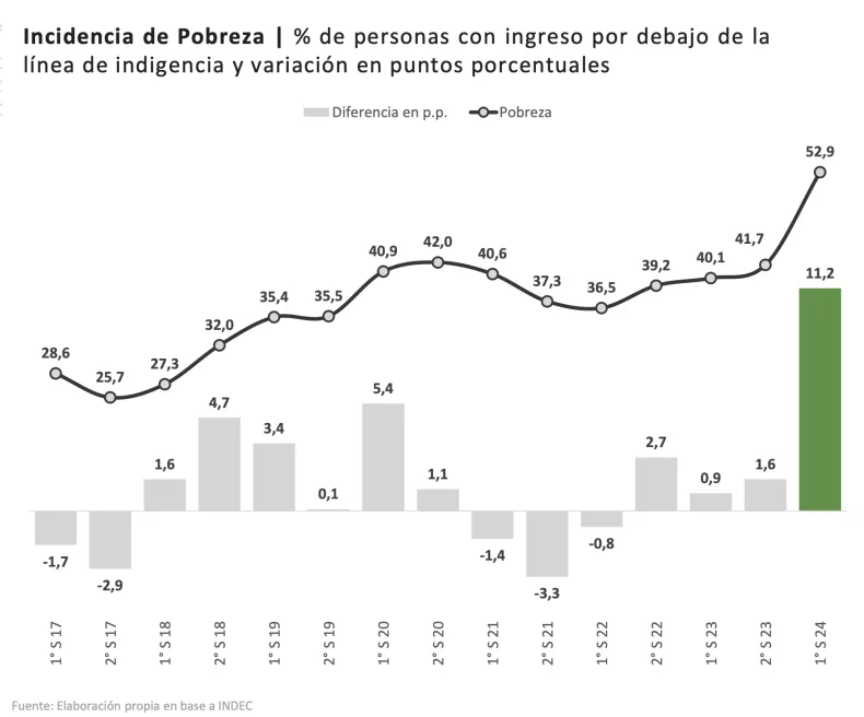 "Hay que remontarse al 2004 para encontrar un dato similar. Los efectos de la devaluación, contracción de los ingresos (jub. y salarios) sumado al impacto sobre el mercado de trabajo de las políticas contractivas, generó que el salto más que duplique el efecto de la pandemia", indicó.