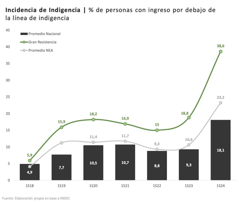 En el caso del Gran Resistencia, el diputado indicó que "4 de 10 personas son indigentes y 3 de esas 4 son pobres". "La falta de políticas de ingresos y de empleo por parte del gobernador Zdero duplicó la tasa de indigencia respecto de un año atrás", agregó.