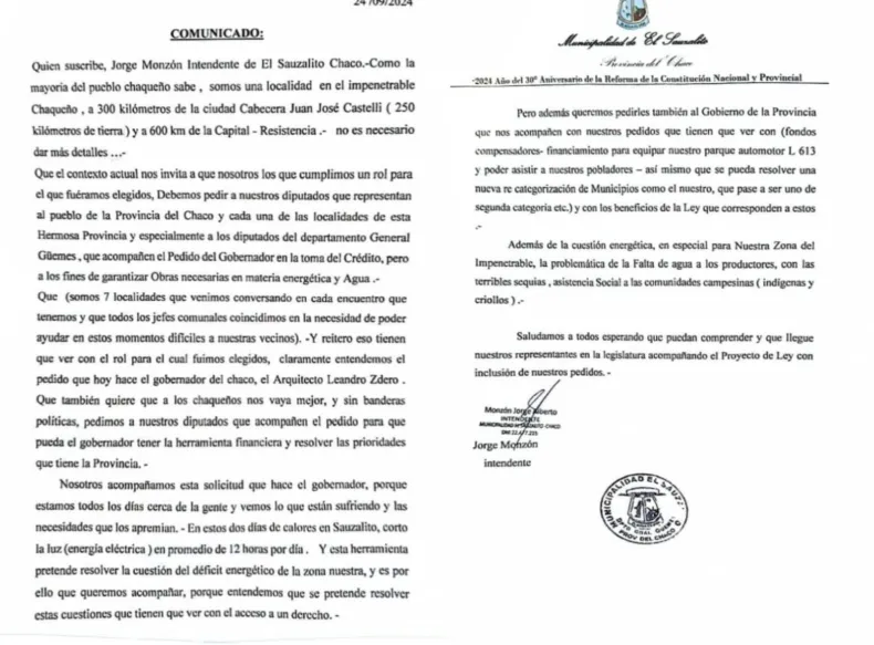 El intendente de la localidad de El Sauzalito, Jorge Monzón, emitió un comunicado para expresar su posición respecto del tratamiento del crédito energético e hídrico solicitado por el Gobierno provincial.
