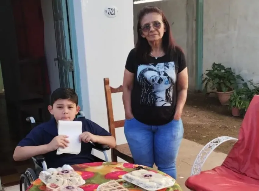 Carmen Duete es la madre de Camilo, un niño de 9 años, que sufre hemofilia y junto a ella y su hermana Brisa están vendiendo bandejas de masitas para solventar un viaje a Buenos Aires porque el mes que viene tienen turno en el Hospital Garrahan.
