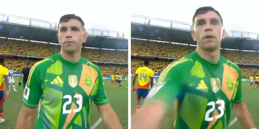 Luego de la derrota de la Selección argentina ante Colombia en Barranquilla, el Dibu sintió como una provocación este largo seguimiento de la TV y reaccionó intentando apartar la cámara que, lógicamente, perdió el plano. El enojo del futbolista argentino se pudo ver en su cara: no le gustó nada está cargada de los colombianos.