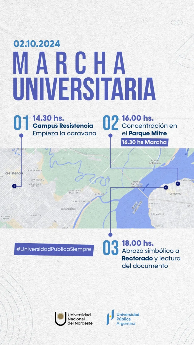 El miércoles 2 de octubre, las 57 universidades nacionales en todo el país volverán a marchar en "en defensa de la Educación y Universidad Públicas", buscando repetir y hasta ampliar la convocatoria de la primera manifestación ocurrida en abril. Tal como en la ocasión anterior las ciudades de Resistencia y Corrientes unificarán la movilización, partiendo de la capital chaqueña para finalizar en la correntina.