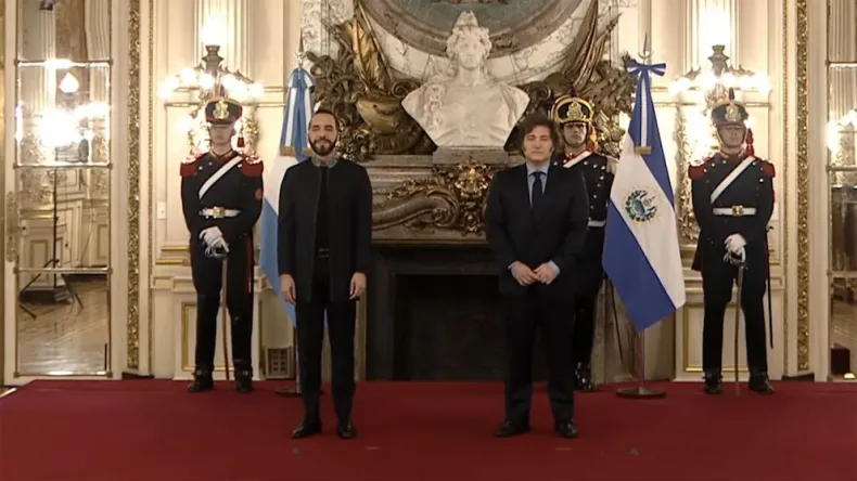 El presidente argentino Javier Milei recibió esta tarde a su homólogo salvadoreño, Nayib Bukele, quien se encuentra en Argentina en visita oficial desde el jueves. Este encuentro marca la segunda vez que ambos líderes se ven este año, tras la reelección de Bukele en junio. Después de la reunión, está programada una recepción en la Quinta de Olivos.