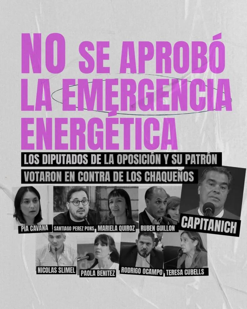 El gobernador Leandro Zderoarremetió en sus redes sociales contra los diputados chaqueños que votaron en contra del proyecto que buscaba declarar la emergencia energética en la provincia. "La luz en el Chaco no es política", expresó Zdero, adjuntando una imagen con los rostros y nombres de los legisladores que se opusieron a la iniciativa que proponía un crédito de 150 millones de dólares para realizar obras que evitarían cortes de luz durante el verano.