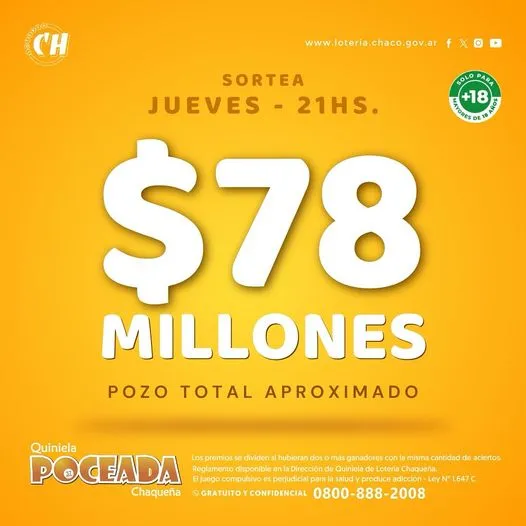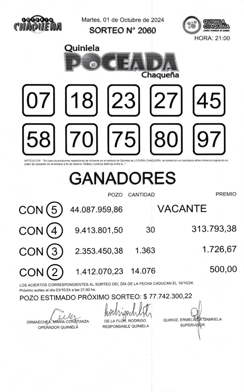 El martes por la noche se realizó el sorteo N°2060 de la quiniela Poceada Chaqueña, cuyo premio mayor no registró ganadores. Por este motivo, se estima un pozo acumulado de 77.742.300 pesos para este jueves.