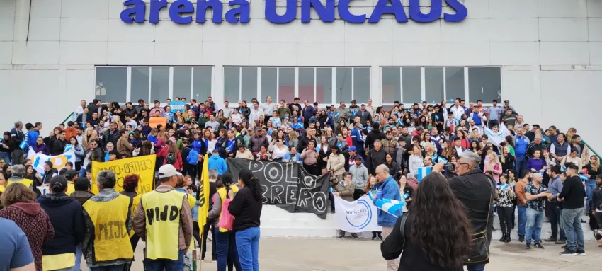 Se realizó un acto en la vereda del Estadio Arena UNCAus y luego se llevó a cabo un abrazo simbólico a la Universidad.