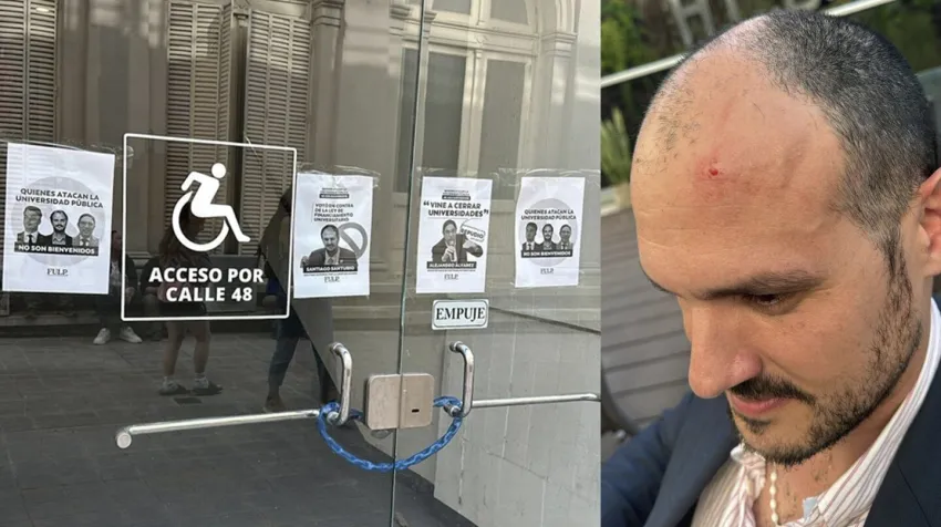 Los legisladores Agustín Romo, Santiago Santurio y Alejandro Álvarez, responsable de Política Universitaria, fueron atacados durante una protesta en una sede de la UNLP en La Plata, donde los referentes libertarios estaban por dar una charla.
