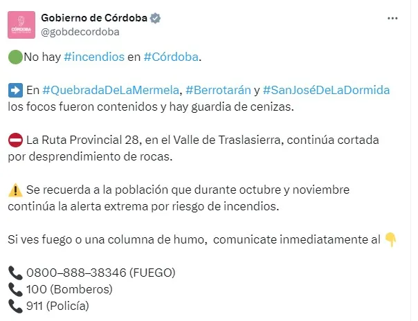 La provincia de Córdoba finalmente logró controlar todos los focos de incendio que la afectaban y brindando un respiro a la población y las tierras. Sin embargo, las autoridades mantienen la alerta extrema durante octubre y noviembre por el riesgo de reactivación en zonas afectadas como Quebrada de la Mermela, Berrotarán y San José de la Dormida, donde se mantienen en guardia de cenizas, según informaron desde el Gobierno de Córdoba.