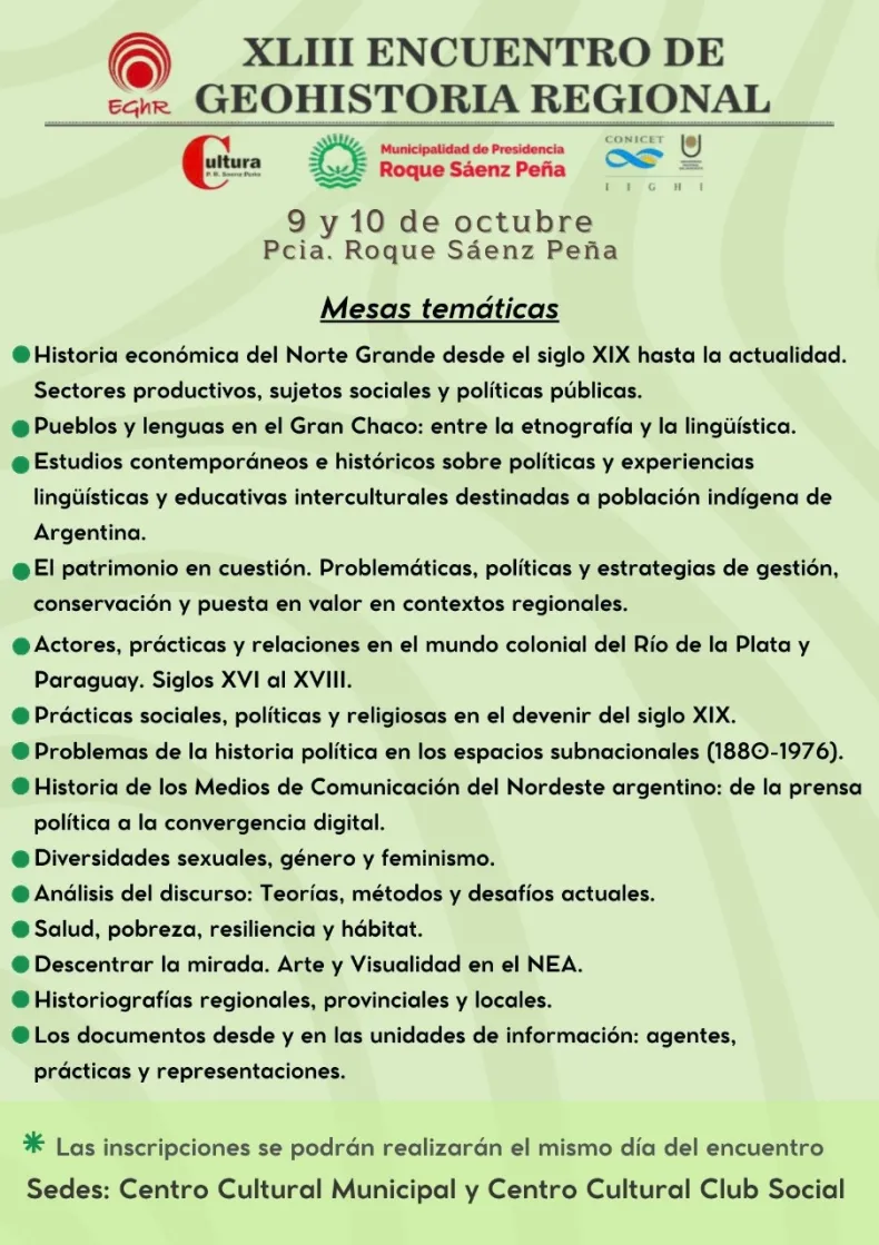 Este miércoles 9 de octubre inicia el XLIII Encuentro de Geohistoria Regional que por primera vez se realizará en la ciudad termal. El mismo es organizado por la Secretaría de Cultura y Educación Ciudadana y el Instituto de Investigaciones Geohistóricas (IIGHI-CONICET/UNNE).