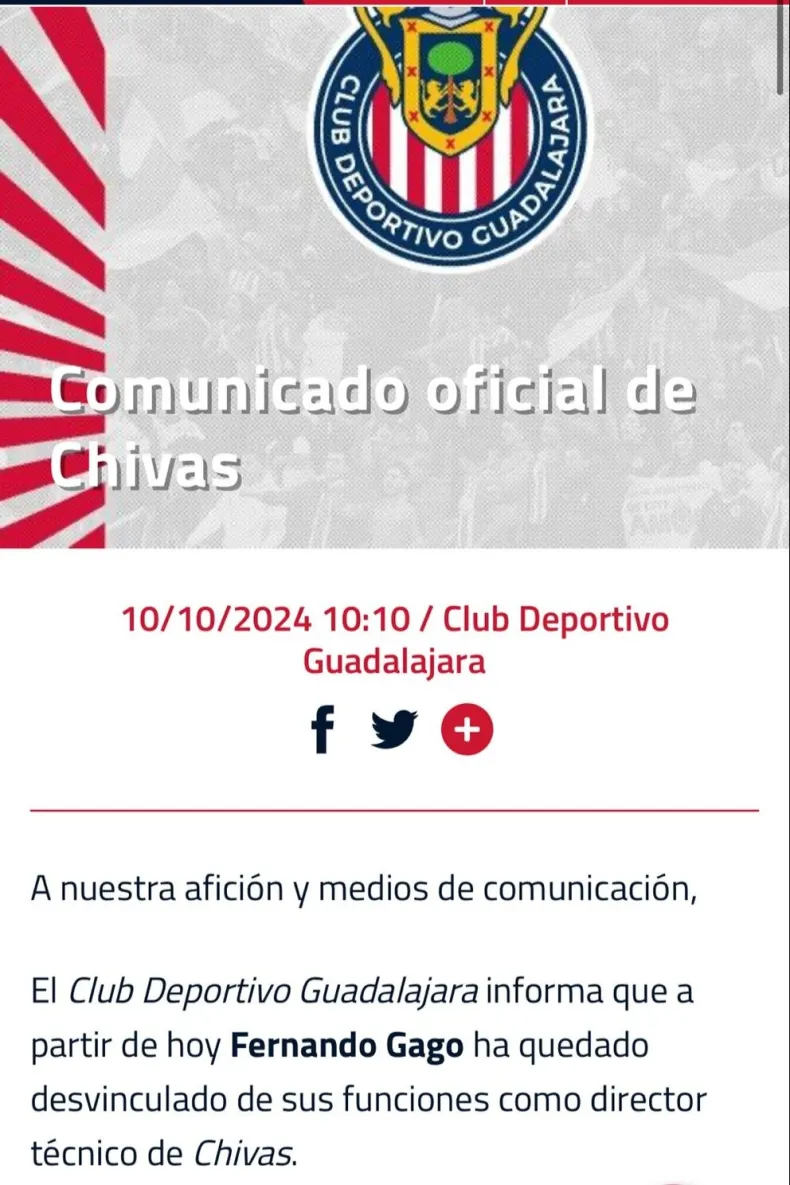 A través de un comunicado oficial, Chivas informó la situación del saliente entrenador: "El Club Deportivo Guadalajara informa que a partir de hoy Fernando Gago ha quedado desvinculado de sus funciones como director técnico de Chivas. En las últimas horas, Gago le comunicó a la directiva su decisión de volver a Argentina junto con su cuerpo técnico. En el corto plazo se anunciará a nuestro nuevo entrenador, quien asumirá el cargo con el liderazgo y compromiso permanentes que el proyecto deportivo y el equipo requieren".
