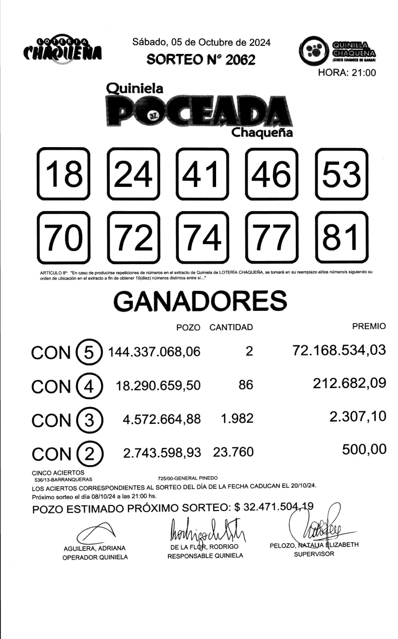La suerte de la Quiniela Poceada les tocó a dos ciudadanos del interior de la provincia, uno de ellos oriundo de Las Breñas, que por circunstancias laborales efectuó su jugada en Barranqueras, así como a un administrativo de General Pinedo que sumó los cinco aciertos gracias a la decisión de repetir los números de un ticket automático anterior.